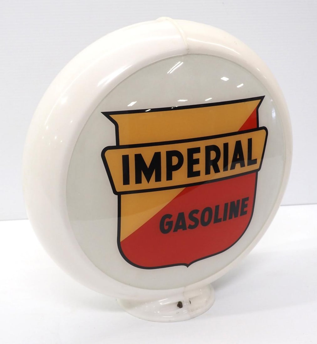 SoldImperial Refineries Gasoline 13.5" Complete Capco Body Gas Pump Globe16.5" T., Two 13.5" lenses mounted in a capco body. Lens #1 has excellent color with light wear and discoloration in the right outer field. The reverse has good color with wash in the field and a flakSee Sold Price