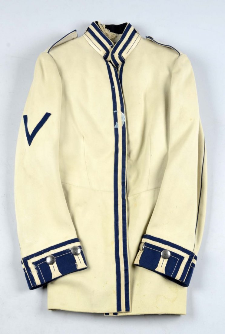 SoldImperial German Summer Tunic.White wool tunic with red stand-up collar and cuffs. Bullion lace on collar and cuffs. Shoulder boards missing, white lining with left breast pocket. Shows used, moth holes and stains. Condition (GoodSee Sold Price