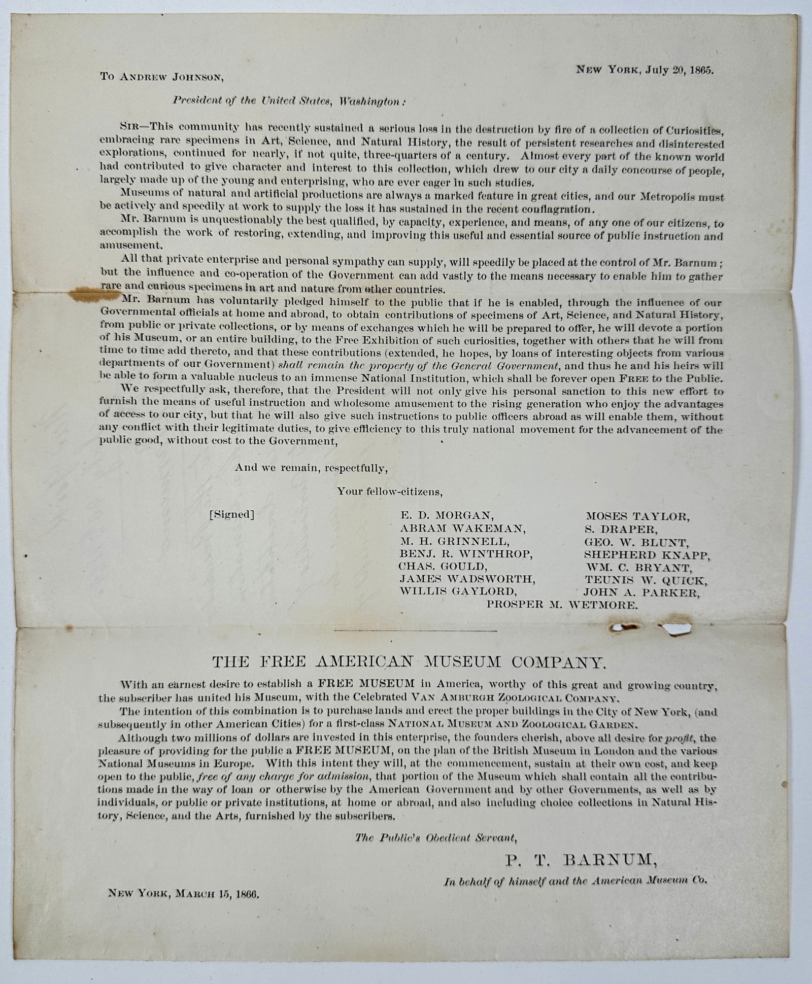IMPORTANT P.T. BARNUM PETITION