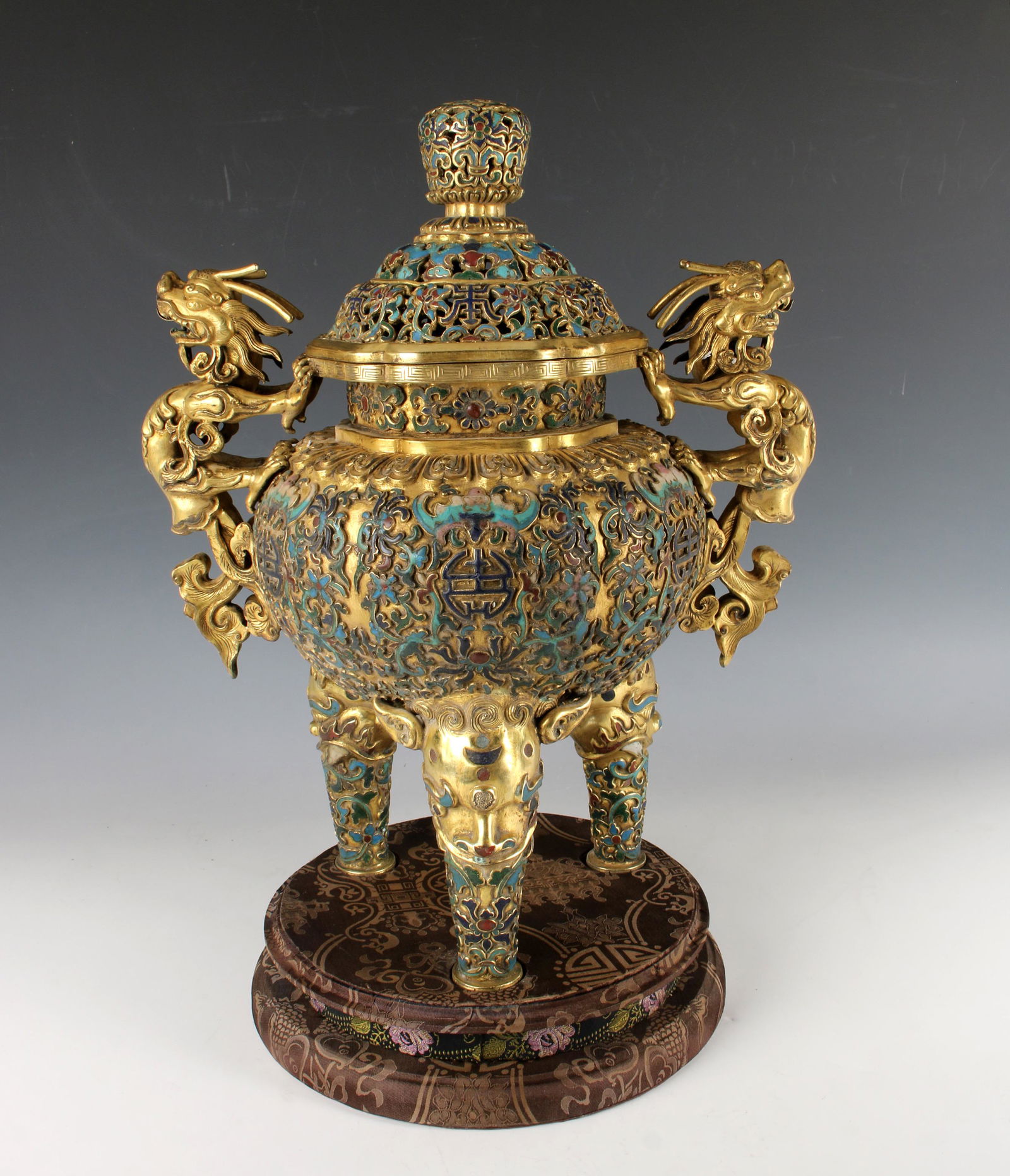 Qianlong Nian Zhi Cloisonn? Enamel Incense Burner with Three Beast Feet, Double Phoenix Ears, and6 days LeftA three-legged aroma burner with Qing Dynasty copper gilt inlaid with a hundred treasure auspicious6 days LeftLarge Cloisonne Incense Burner with Beast-shaped Knob and Two Dragons Playing with a Pearl12 hrs LeftXuande Nian Zhi Cloisonn? Enamel Incense Burner "Peaceful Elephant"6 days LeftAn Exquisite Gilt Bronze Inlaid Gems Flower and Fruit Pattern JarMar 13, 2026Gilded bronze openwork relief cloisonne incense burner ornament13 hrs LeftHan Dynasty Bronze Censer with Gold/Silver/Turquoise Inlay and Standing Bird6 days LeftAn Exquisite Gilt Bronze Dragon Pattern Beast-Ears Tripod CenserMar 07, 2026A CLOISONNÉ ENAMEL CENSER WITH CHI DRAGON HANDLES AND FIGURATIVE SCENE6 days LeftTripod incense burner with lid China, 20th century323 Lots AwayLidded Censer with Lion Ears, Painted Enamel with Medallion of Western Figures, Qianlong Reign, Qing2 days LeftAn Exquisite Bronze Inlaid Gold and Silver Inlaid Turquoise With Inscription Double-Ears JarMar 13, 2026An Exquisite Gilt Bronze Beast-Face Pattern With Inscription Double-Ears Tripod CenserMar 04, 2026A Rare Cloisonne Lotus and Dragon Pattern Beast-Ears Elephant-Legs Censer6 days LeftA Exquisite Gilt Bronze Inlaid Gems Lotus Pattern Double-Ears and Tripod CenserMar 04, 2026A Huge Cloisonne Lotus Figure Pattern Dragon-Ears Beast-Legs CenserMar 14, 2026