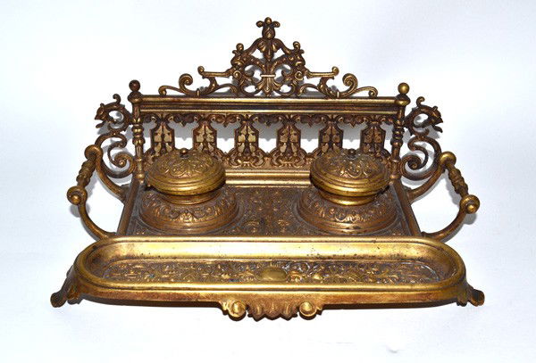 SoldGerman Brass Inkwell Set, C. 1900, H 6.5", L 14.5", D 11"German Brass Inkwell Set, C. 1900, H 6.5", L 14.5", D 11" | Two Hinged Inkwells with Relief Angel Designs, Pierced Base with Griffin Forms on the Backsplash, Scissors And Letter Opener Within a SheathSee Sold Price