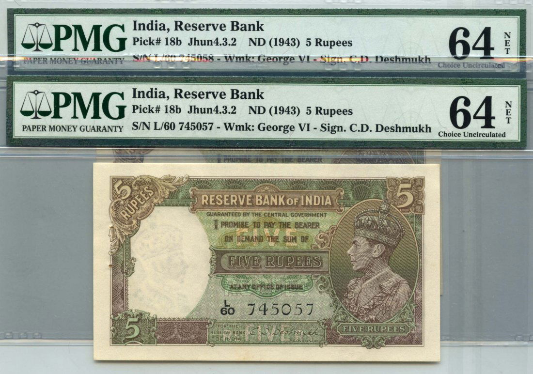 INDIA George VI: 5-Rupees 1943 Consecutive pair