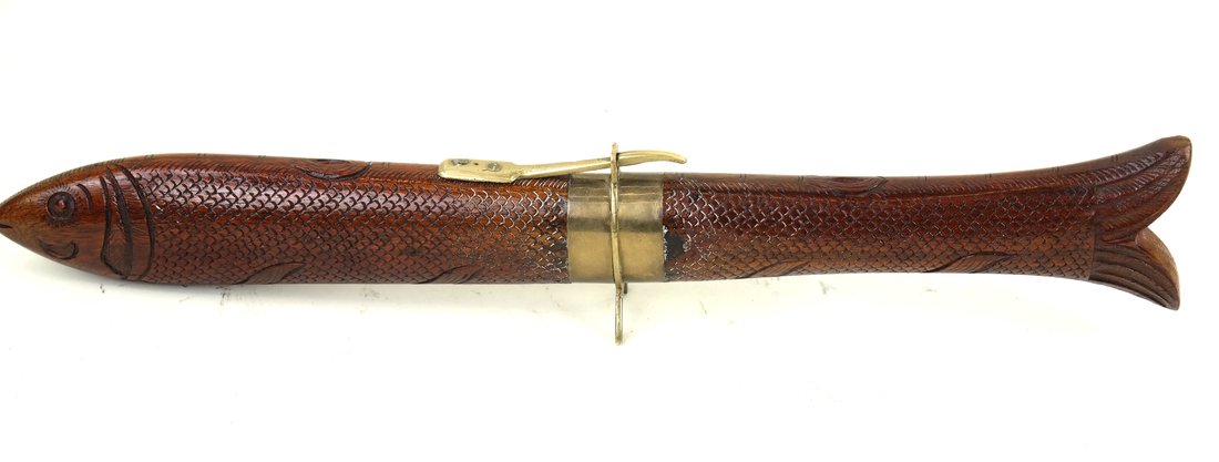 SoldTwo Piece Carving Set in Fish Form CaseTwo-piece carving set, knife and fork, in lacquered wood fish form case on stand. Knive blade 7" L; case 16 1/2" L. Provenance: The Collection of Katherine Henrietta de Stuers.See Sold Price