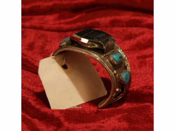 SoldOld Pawn Turquoise Watch BraceletSterling Silver | Genuine Turquoise | Old Pawn Turquoise Watch Bracelet | Navajo Native American Southwest Indian Jewelry | Weight: 76.2 Grams, | Dimensions: Watch: 7.5" length, 1.25" face width |See Sold Price