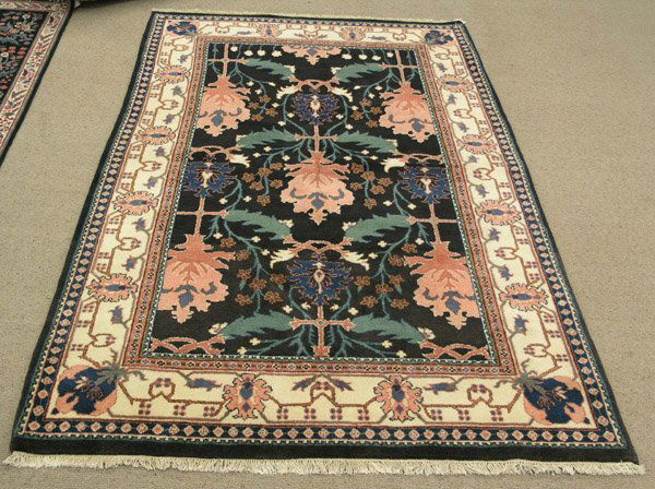 SoldIndo-Oushak CarpetIndo-Oushak Carpet India, contemporary The sky-blue field with polychrome stylized flora overall is within an ivory palmette and vine border. Approximately 9 feet 11 inches x 8 feet. CSee Sold Price