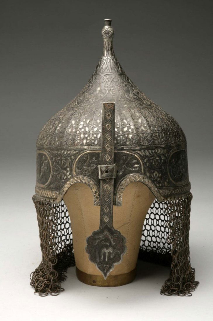 RARE INDO PERSIAN HELMET WARRIOR FIGS ON HORSETRADITIONAL INDO PERSIAN HELMET WARRIOR FIGS ON HORSE ARABIC INSCRIPTION.Antique Indo Persian warrior helmet Persian Inscription engraved.Bottom rim hand engraved and chiseled Persian inscription.DoomSee Sold Price