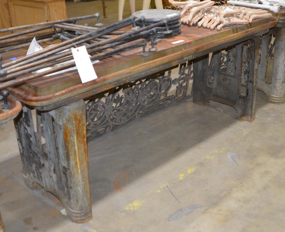 SoldPINE AND CAST IRON INDUSTRIAL MACHINE BASE TABLEAntique cast iron machine base legs, with added wooden top. Table top is made from reclaimed wood over 100 years old.Dimensions: H 32.5" x W 72.5" x D 24.5".Condition: Scattered scuffs and dings to woSee Sold Price