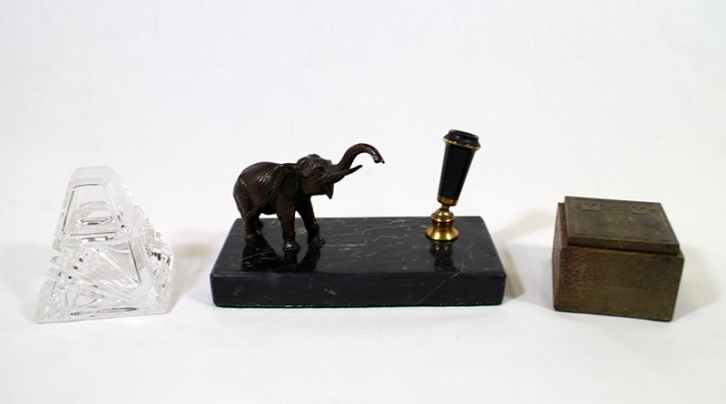 SoldInkwell CollectionInkwell Collection (10) items of various sizes and materials including a 1904 St. Louis Worlds Fair 'Show Me' bronze donkey, a dore bronze and marble double well and a Mod. Brevet brass single, most mSee Sold Price