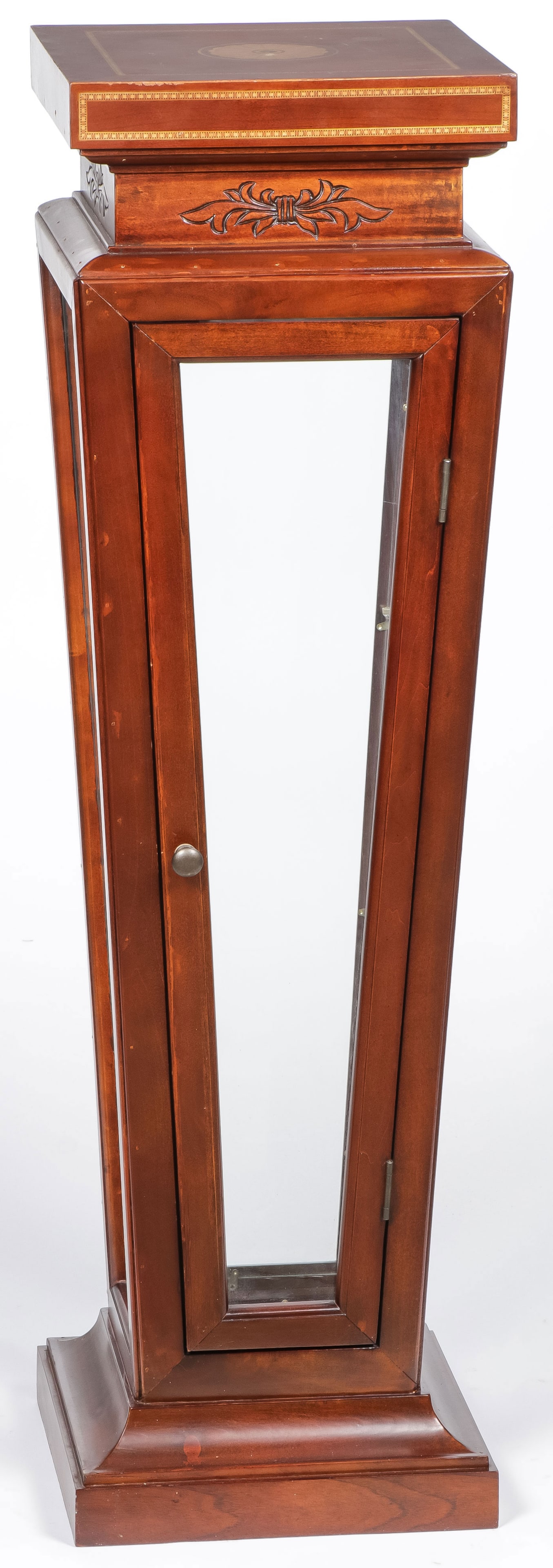 SoldA vintage beveled mirror pedestal display stand***This Item is Located in NYC***A vintage beveled mirror pedestal display stand with brass Corinthian column detail. DIMENSIONS: 10.5”W x 10.5”D x 35.5”HSee Sold Price