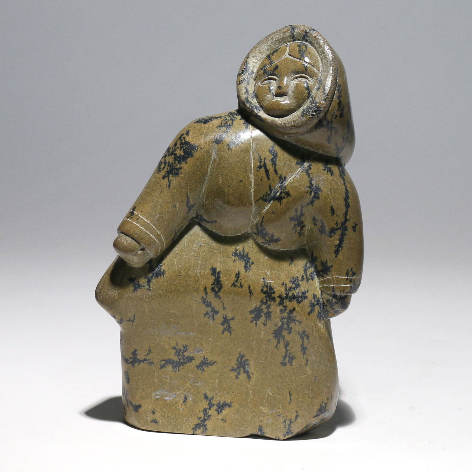 SoldInuit Carved Stone Figure of a Standing PersonA finely carved Inuit stone figure depicting a person in a parka, standing with hands at sides, the face and hood stylized in traditional form. Executed in mottled green stone with darker natural inclSee Sold Price