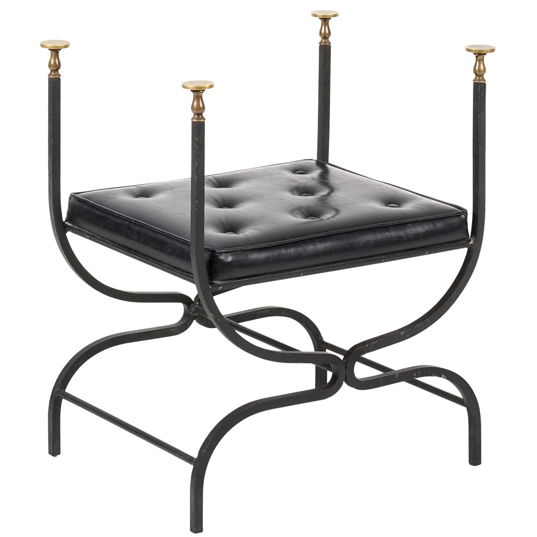 SoldOscar Bach Style Iron and Brass Curule-Form StoolWith a removable wool cushion. Height 30 3/4 inches, width 21 1/2 inches, width 14 1/2 inches.See Sold Price