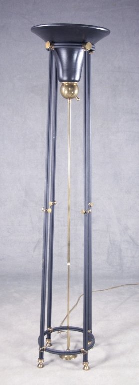 SoldBrass & Black Iron Torchiere Floor Lamp. ModernisBrass & Black Iron Torchiere Floor Lamp. Modernist. Three Corseted legs with brass feet. -- Dimensions: H: 64 inches: W: 15 inches: D: 15 inches ---See Sold Price