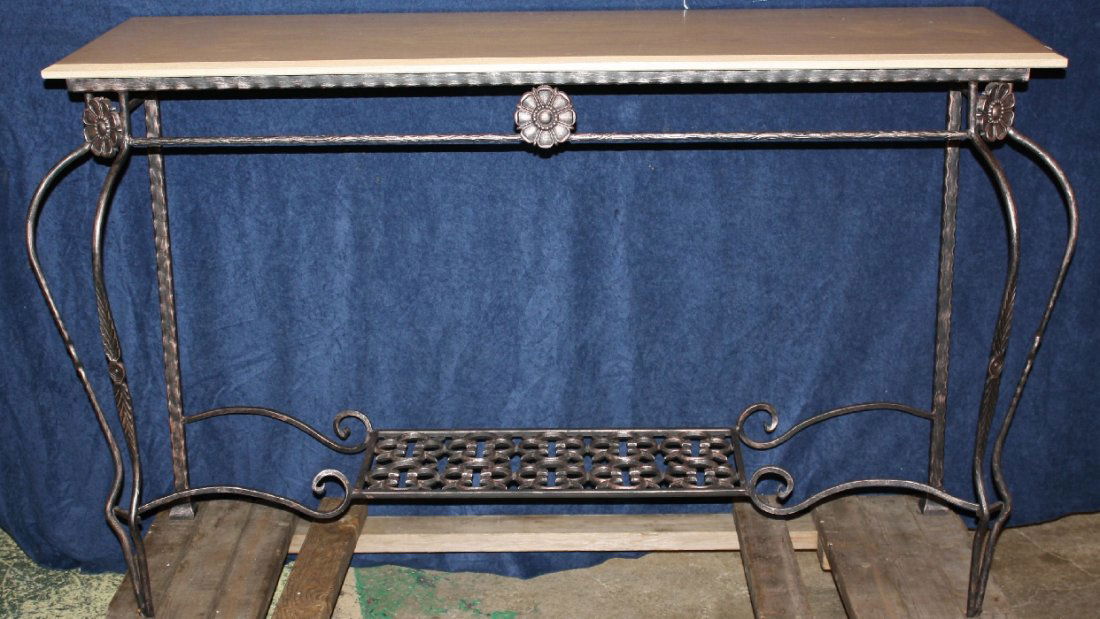 SoldTravertine Marble Top Iron Base Hall Console Table.Travertine Marble Top Iron Base Hall Console Table.-- Dimensions: H: 39 inches: W: 40 inches: D: 12.5 inches ---See Sold Price