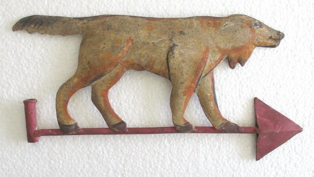 SoldSheet iron dog weathervaneTitle: Sheet iron dog weathervane Provenance/Additional Info: Wonderful Sheet iron folk art running dog weathervane. Formed from 3 pieces of sheet iron; body, hind quarter, and legs. Wrought reinforceSee Sold Price