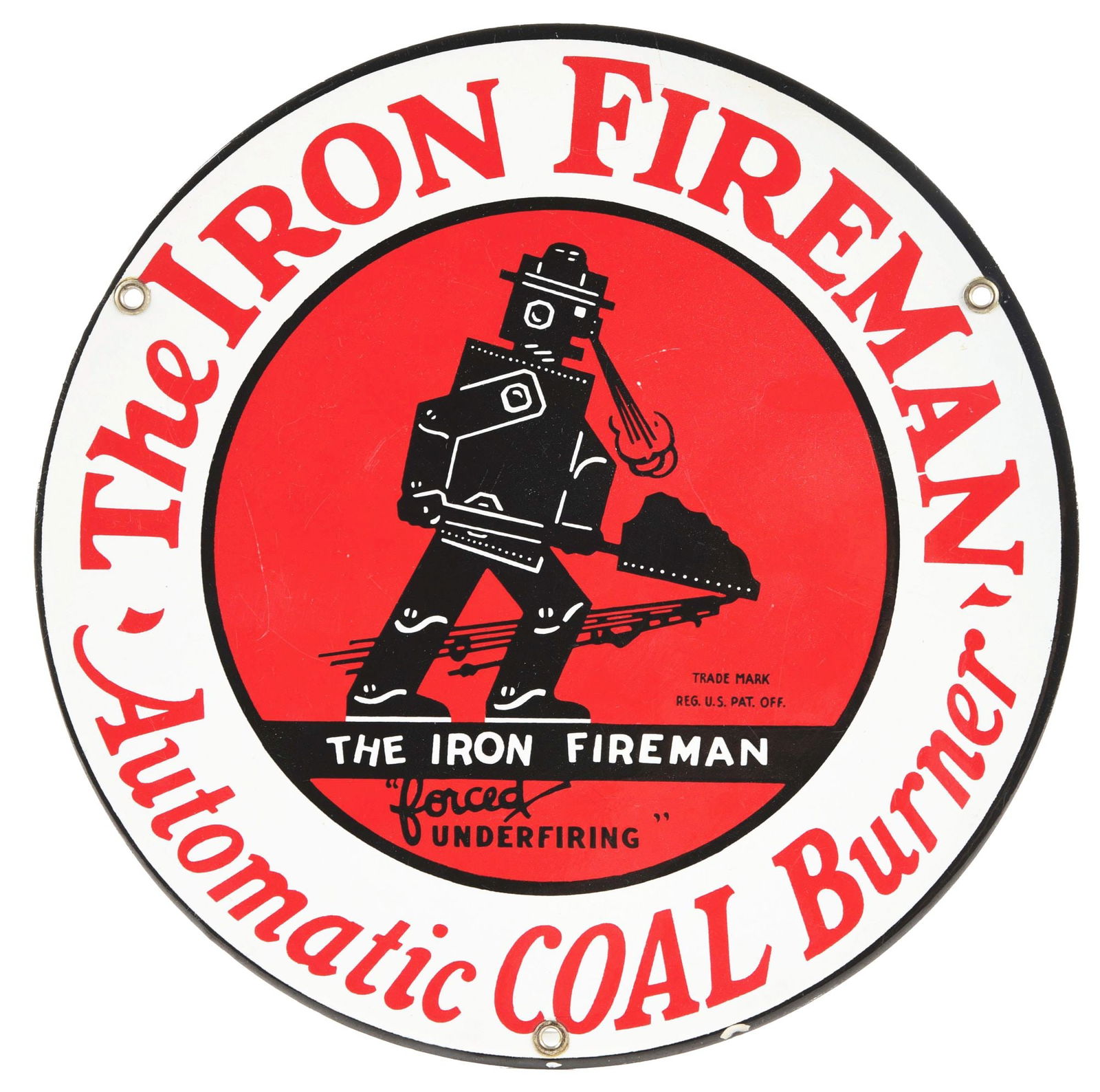 THE IRON FIREMAN PORCELAIN SIGN W/ IRON FIREMAN GRAPHIC.