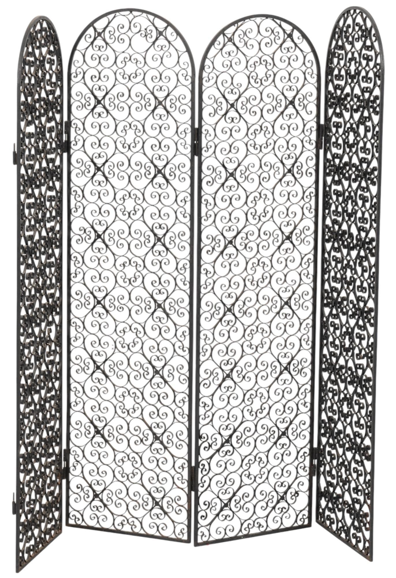 SoldWROUGHT IRON FOLIATE DECORATED FOUR-PANEL SCREENWrought iron four-panel folding screen, late 20th c., with floral and foliate decoration, approx 77"h, 25.75"w Start Price: $150.00See Sold Price