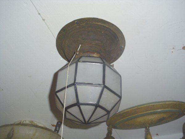 SoldDiminutive Pair of American Hanging Brass and Iron Hall Chandeliers, early 20th c., of urn form,Diminutive Pair of American Hanging Brass and Iron Hall Chandeliers, early 20th c., of urn form, issuing three brass leaf form lights with frosted glass hexagonal shades, with canopy and chain, FixturSee Sold Price