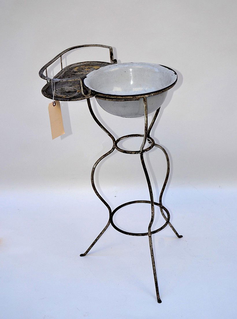 SoldNice, Vintage French Iron Washstand with Enamel BowlWash stand is 38 1/2" tall and 26 1/4" wide and 18" deep. Enamel bowl has some wear. The bowl is approximately 17" diameter, and 6" tall.See Sold Price