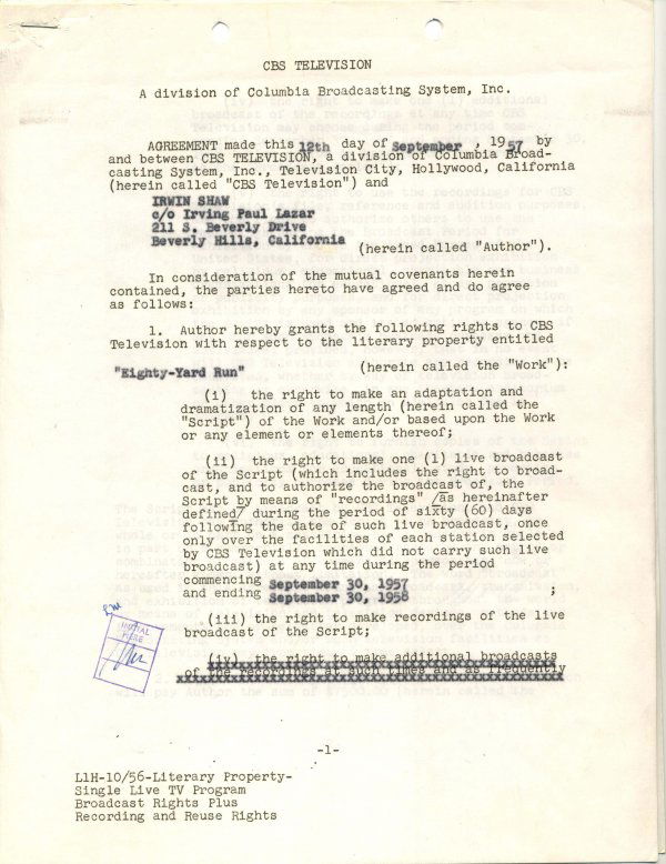 Irwin Shaw Signed Contract for 'Eight Yard Run'
