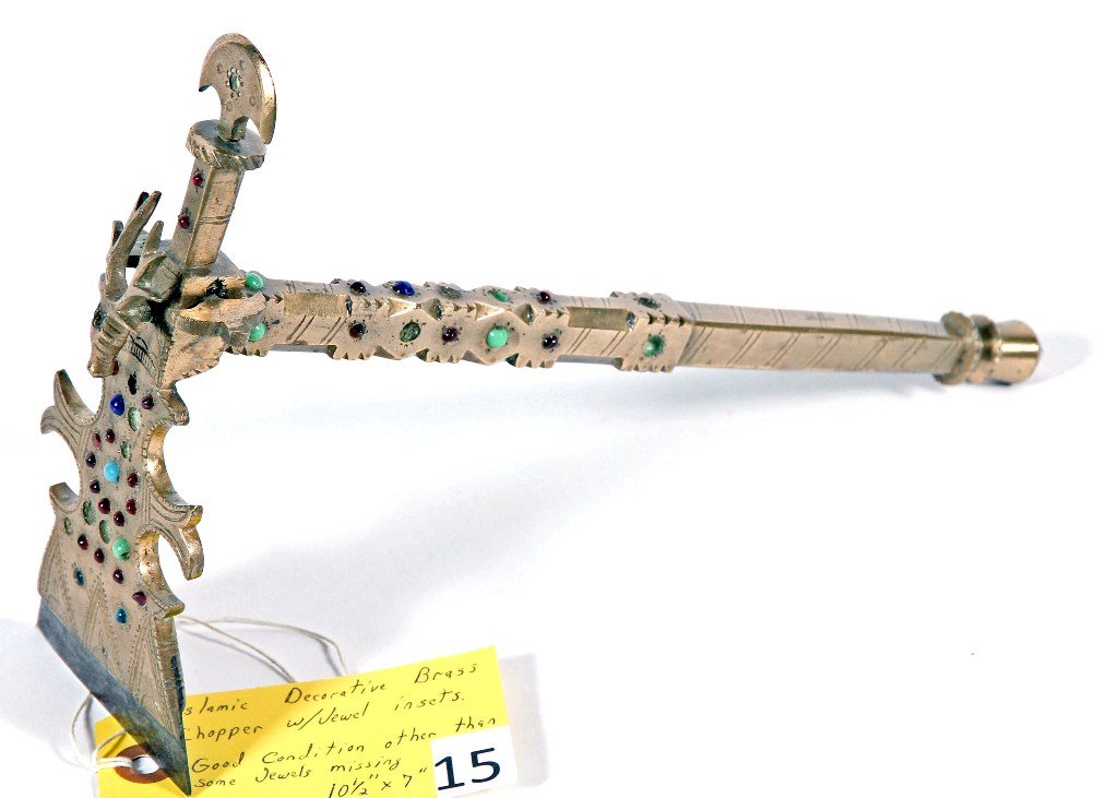 Antique Arabic Morocco Powder Flask Decorative Brass & Bone-Inlaid Gunpowder FlaskMar 14, 2026A Han Dynasty copper wrong gold and silver inlaid jade dragon pattern belt hookMar 22, 2026A GILT BRONZE VAJRA CHOPPER RITUAL OBJECT1 day LeftGood Antique Islamic Arabic Arab SAIF Sword in Engraved Silver Mounts, Original Tasseled Cord forMar 14, 2026Antique Islamic Arabic Arab Moroccan Kouya A Dagger Knife in Ornate MountsMar 28, 2026Ornate Middle Eastern Style Jambiya Dagger with Decorated ScabbardFeb 27, 2026Buddhist 17th C. Tibetan BRONZE Battle AXE Entwined Mythic Figures & Remnants of GildingMar 28, 2026A fine 18th-19th Century Mughal Indian Tabar Axe/hatchet with Wootz Blade and gilt-highlightedMar 14, 2026A bronze from the Warring Han Dynasty with gold and silver inlaid with turquoise hooksMar 14, 2026BRONZE AND GOLD SWORDS WITH IMPERIAL INSCRIPTIONS FROM THE SPRING AND AUTUMN PERIODMar 01, 2026AN INDO-PERSIAN STEEL TABARZIN AXE, 19TH CENTURYMar 06, 2026AN INDO-PERSIAN ANIMAL-HEADED COMBINATION AXE AND HAMMER, 18TH - 19TH CENTURYMar 06, 2026Antique Islamic Mughal Indian All-steel Fighting Axe / War Hammer with Silver Koftgari FloralMar 14, 2026Antique Brass-Mounted Sword Dragon Reliefs andFeb 28, 2026Vintage Horse BrassesTibetan Gilt Bronze Ritual Kartika KnifeMar 07, 2026