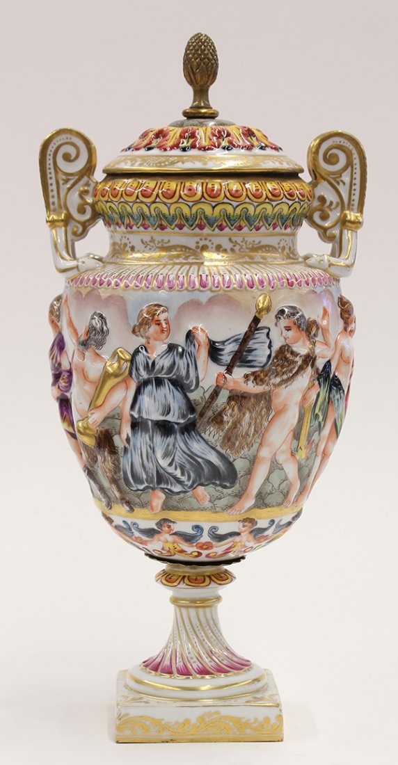 SoldLarge Capodimonte Porcelain Lidded UrnThis large Capodimante Italian porcelain lidded urn depicts numerous neoclassical figures in relief. Garlands ring the top portion, and there are gold accents to the lid, arms, and base. It measures 1See Sold Price