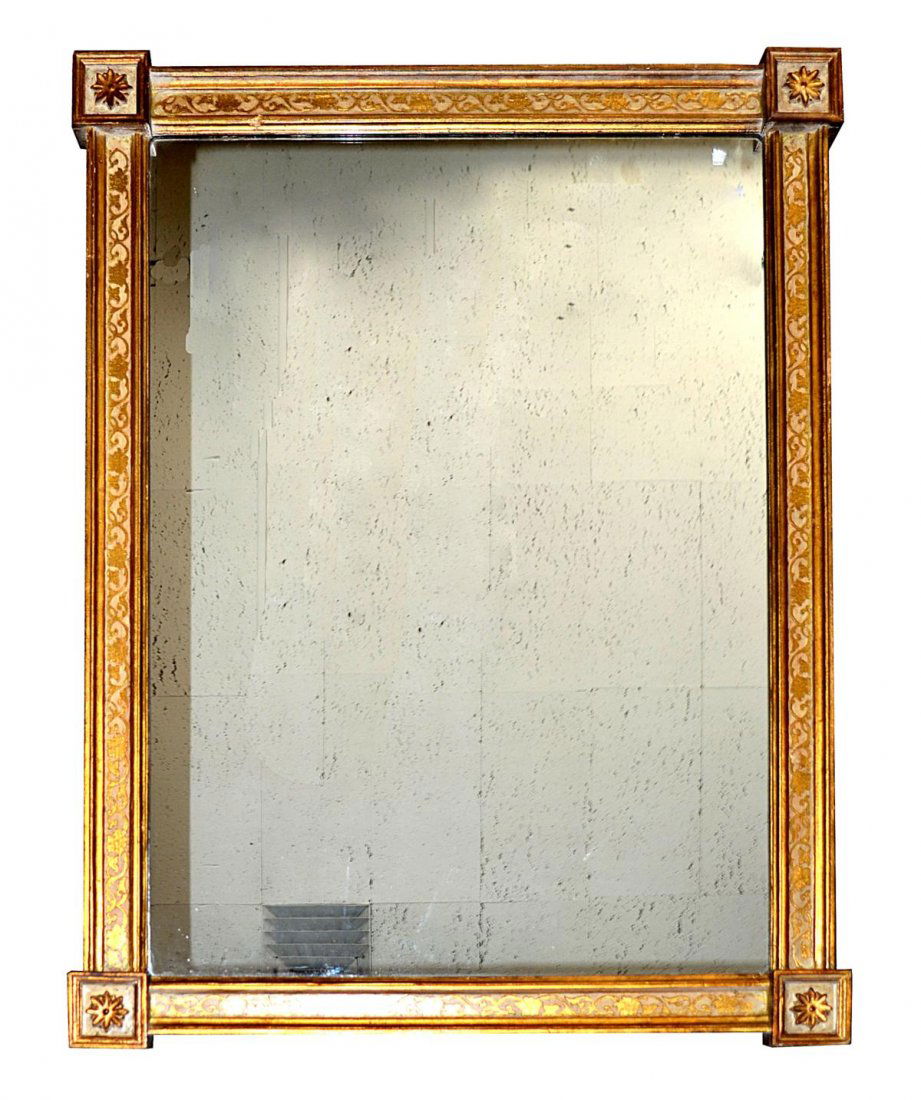 SoldITALIAN VENETIAN PAINTED FLORAL MIRRORItalian Venetian painted wall mirror, 20th c., rectangular frame with scrolled foliates and floral trim, parcel gilt accents, encasing flat mirror plate, restoration to crest, approx 51"h, 30"w, 30lbsSee Sold Price