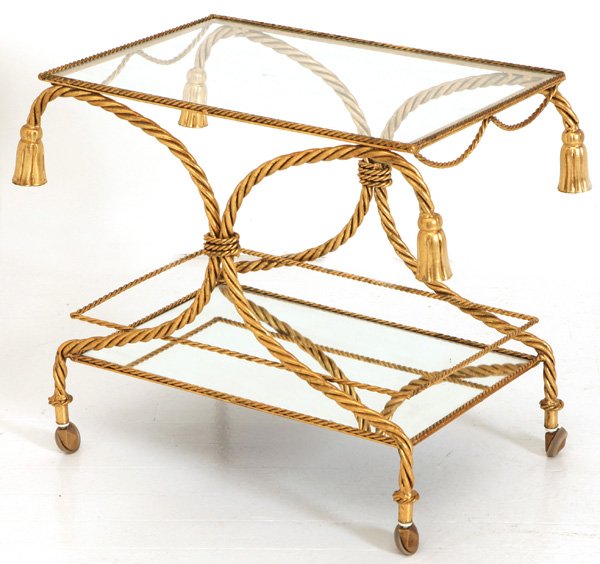 Mid Century French Bagues Style Brass Rope Bar CartVintage Regency Gilt Twisted Bar Cart with Glass and Mirror Shelves5 days LeftFRENCH GILT METAL ROCAILLE BAR CART / SERVICE TROLLEY4 days LeftVintage Regency Gold Brass Glass Side Table with Swags and TasselsFeb 27, 2026Regency Style Brass and Steel Tea Cart 20 x 36 x 31.5Feb 17, 2026FRENCH GILT METAL & GLASS 2-TIER BAR CART / SERVICE TROLLEY3 days LeftHollywood Regency Style Brass Footman Low Table20 hrs LeftMidcentury Brass and Glass Bar CartFeb 27, 2026French Modern Two-Tier Brass and Walnut Bar CartApr 14, 2026Chic Faux Bamboo Brass and Glass Serving Cart TrolleyFeb 27, 2026Italian gilt metal rope and tassel vanity stool2 days LeftMid-Century Glass Top Tea or Bar CartMar 06, 2026Louis XVI Style Painted 2 Tier Trolley / Bar Cart6 days LeftMid-Century Modern Style Oval Bar Cart, Italy, 1970s5 days LeftADNET STYLE BAR CART ON WHEELS MADE FROM BRASS AND IRON C 1950Feb 25, 2026Contemporary Gilt Metal & Glass Cocktail TableFeb 27, 2026
