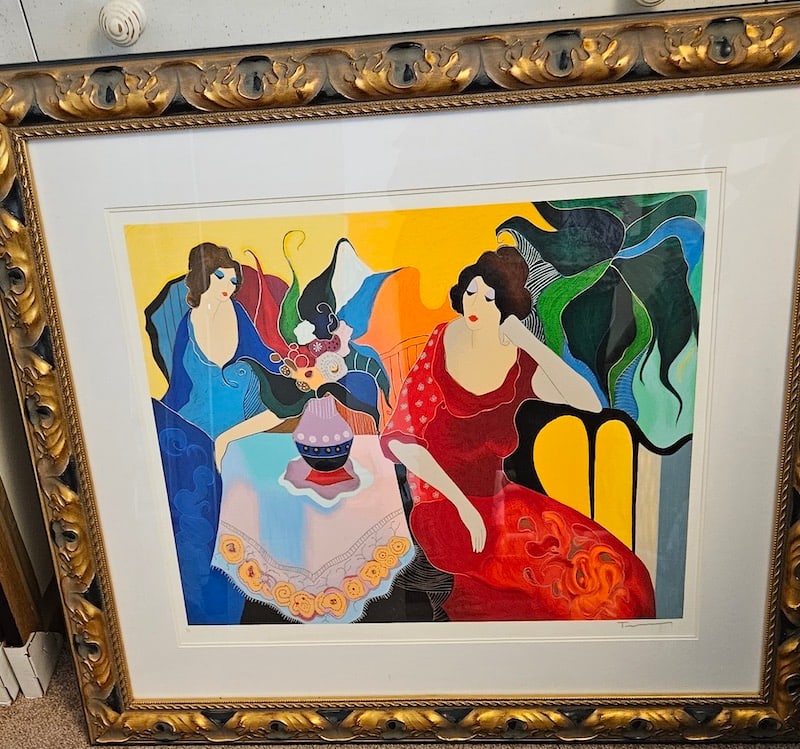 Sold(359) Itzchak Tarkay " Becky & Donna II"Serigraph embellished on canvas. Image measures 17" x 21 3/4". Framed 29" x 33". Estimate $500 - $600. Starting bid $100.See Sold Price