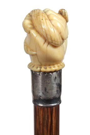 SoldIvory Lion CaneCirca 1880. A carved ivory lion with beaded glass eyes holding a snake to the ground, ornate gold filled collar, hardwood shaft and 3" ivory ferrule. H. 2 1/2" x 3 1/2", O.L. 35"See Sold Price