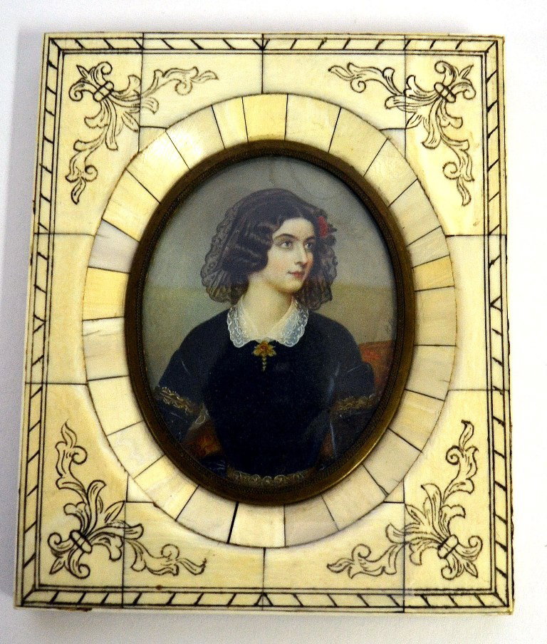 ANTIQUE PAINTED PORTRAIT IN CARVED BONE FRAME