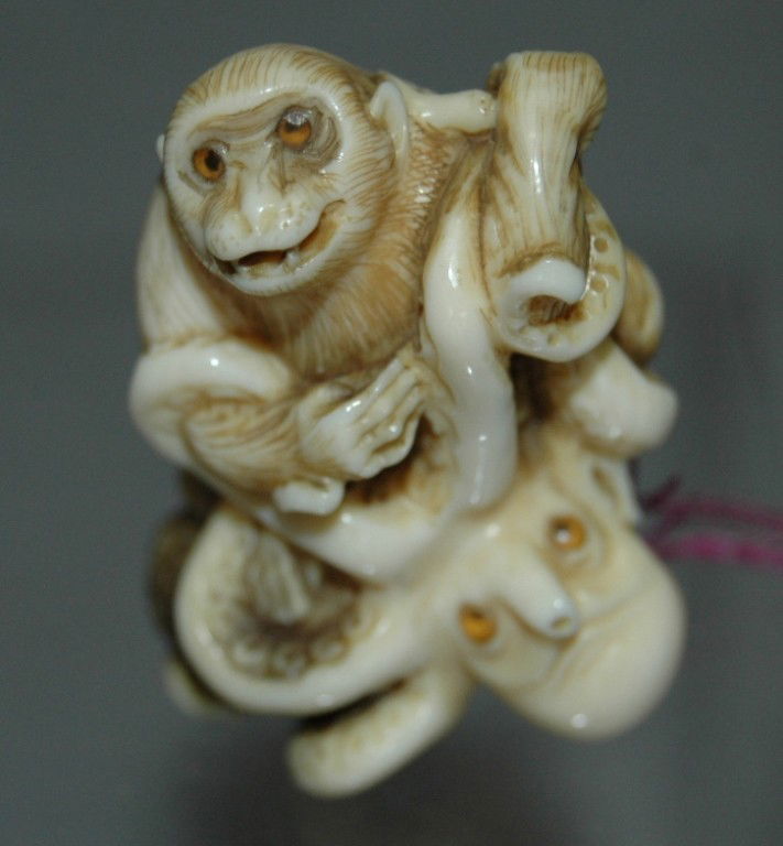 IVORY NETSUKE OCTUPUS ENTANGLED WITH APE