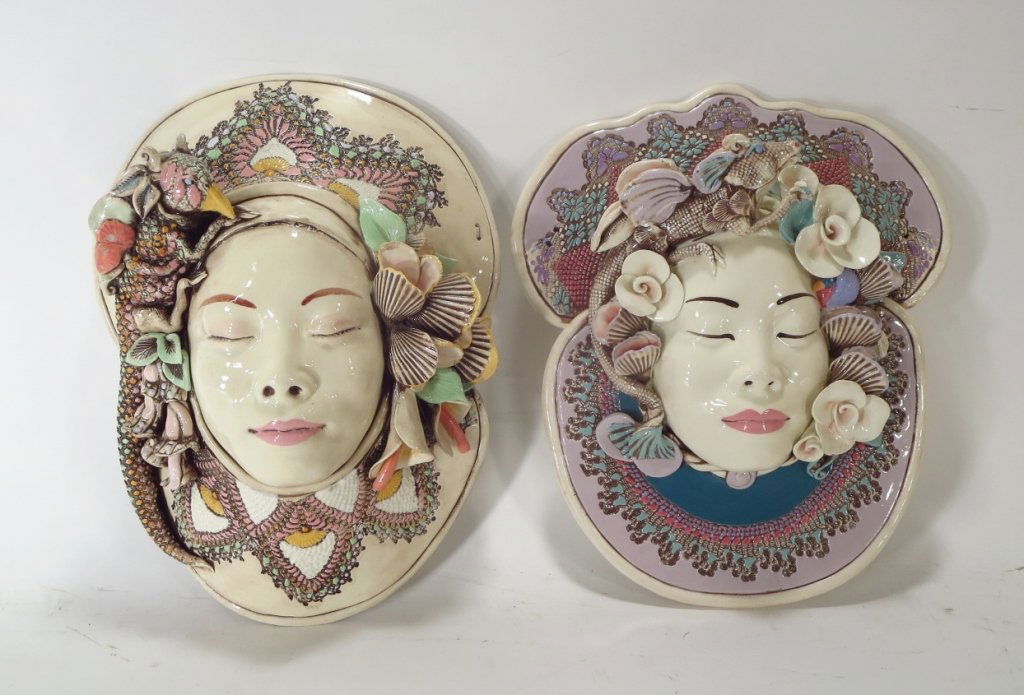 J. Barber, 2 Ceramic Dragon Masks,Shells, Bird