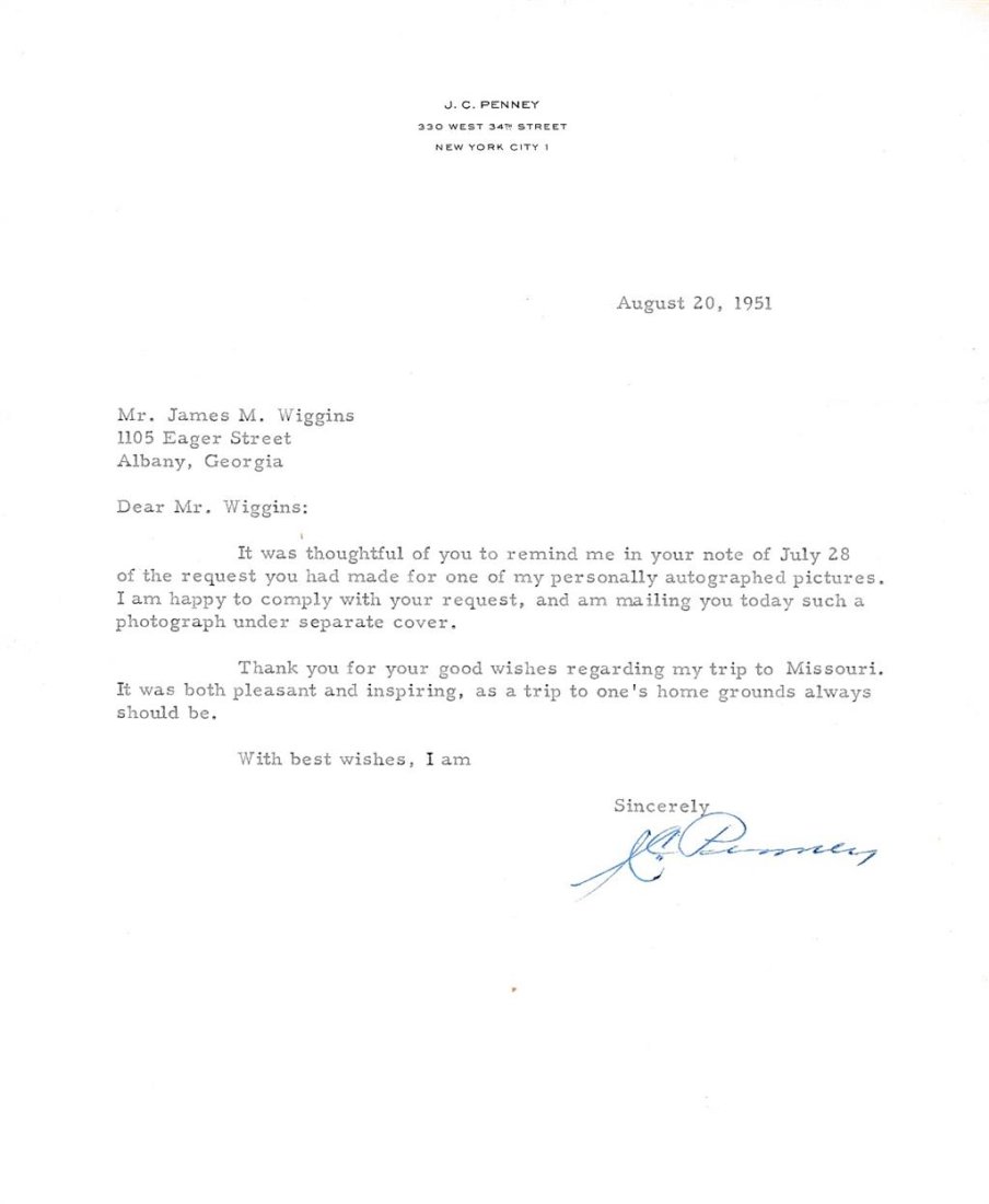 SoldJ. C. Penney- TLS from 1951 SignedTLS on J. C. Penney letterhead complying with an autograph request and discussing a recent trip in part, "Thank you for your good wishes regarding my trip to Missouri. It was both pleasant and inspiriSee Sold Price