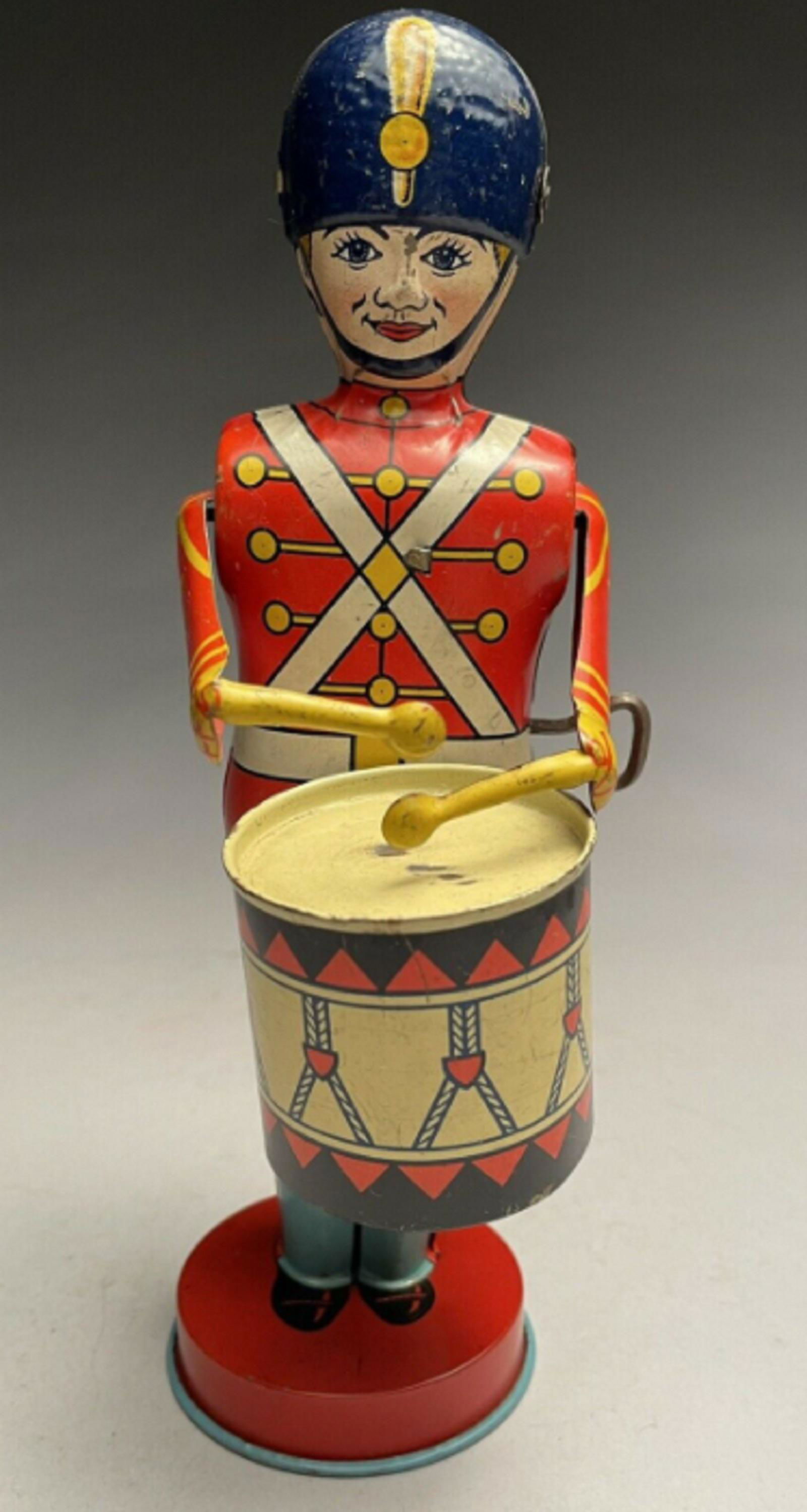 SoldEarly Tin Litho J. Chein Drummer SoldierApprox. 7" tall. Hand controlled. Working condition. Some scuffs and scratches.See Sold Price