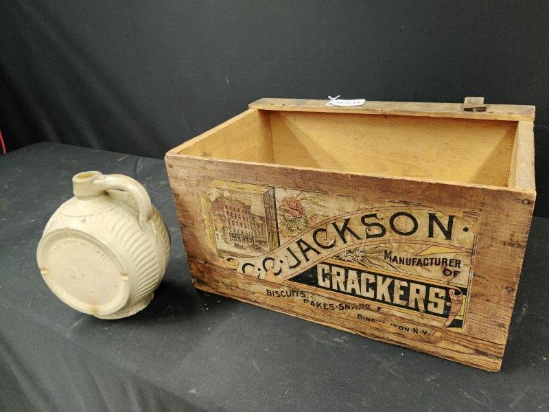 Jackson cracker box and stoneware jug
