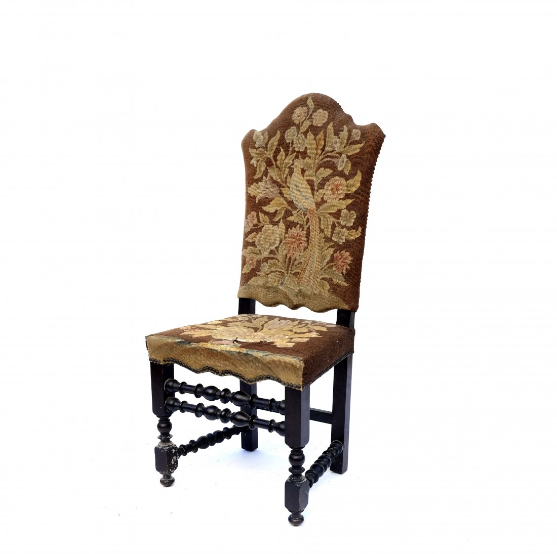 Sold(lot of 4) Jacobean style side chairs(lot of 4) Jacobean style side chairs, each having a cream upholstered seat and back and rising on a scrolled frame, 39"hSee Sold Price