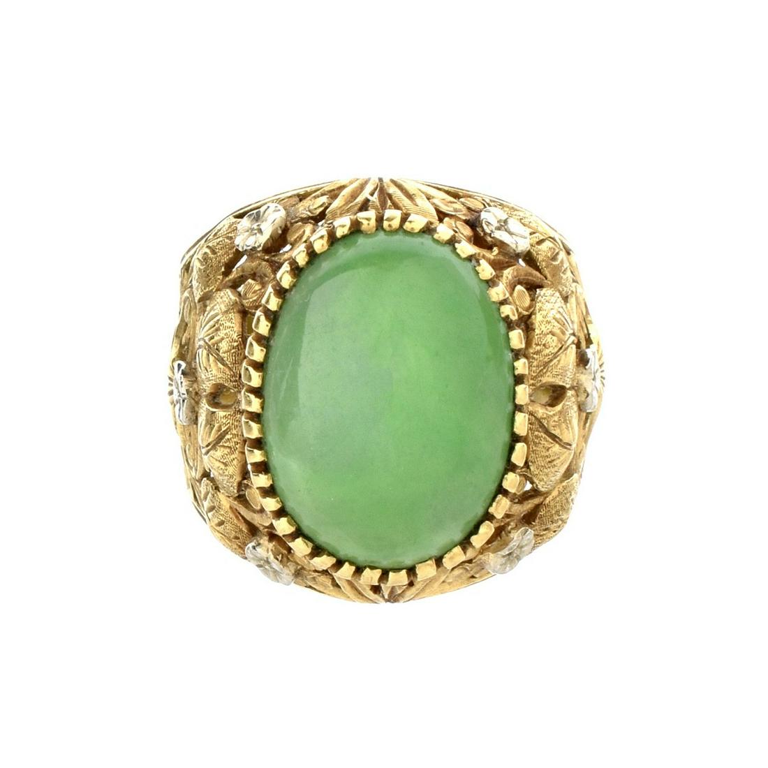 SoldJade, 18k Yellow Gold Ring.Jade, 18k Yellow Gold Ring. Featuring one oval jadeite cabochon measuring approximately 15 x 11.3 x 6.05 mm, set in an 18k yellow gold mounting. Accompanied by a GIA Gemological Report No. 5171393606See Sold Price