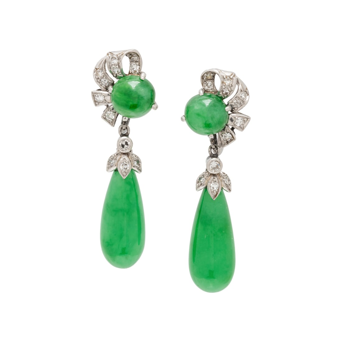 SoldJADE AND DIAMOND EARRINGSJADE AND DIAMOND EARRINGS Consisting of two round jade cabochons and two jade drops with white gold openwork sections containing 132 round brilliant cut diamonds weighing approximately 0.60 carat totaSee Sold Price