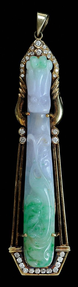 SoldCHINESE CARVED JADE & DIAMOND PENDANT.This sweet piece has some gray edges and a fruit with bird motif. The 14kt yellow gold custom bail has a branch support with two round brilliant cut diamonds, approx. .10 ct. tw., 2 1/4 in. long, 18.3See Sold Price