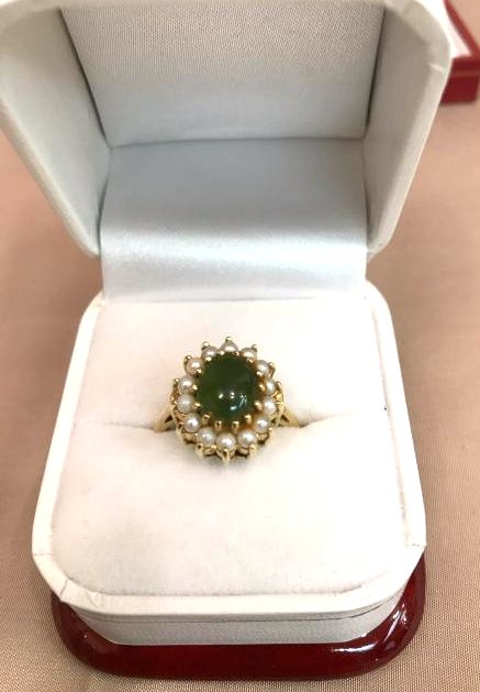 14k Yellow Gold Nephrite Jade and Diamond Ring. Size 4.5