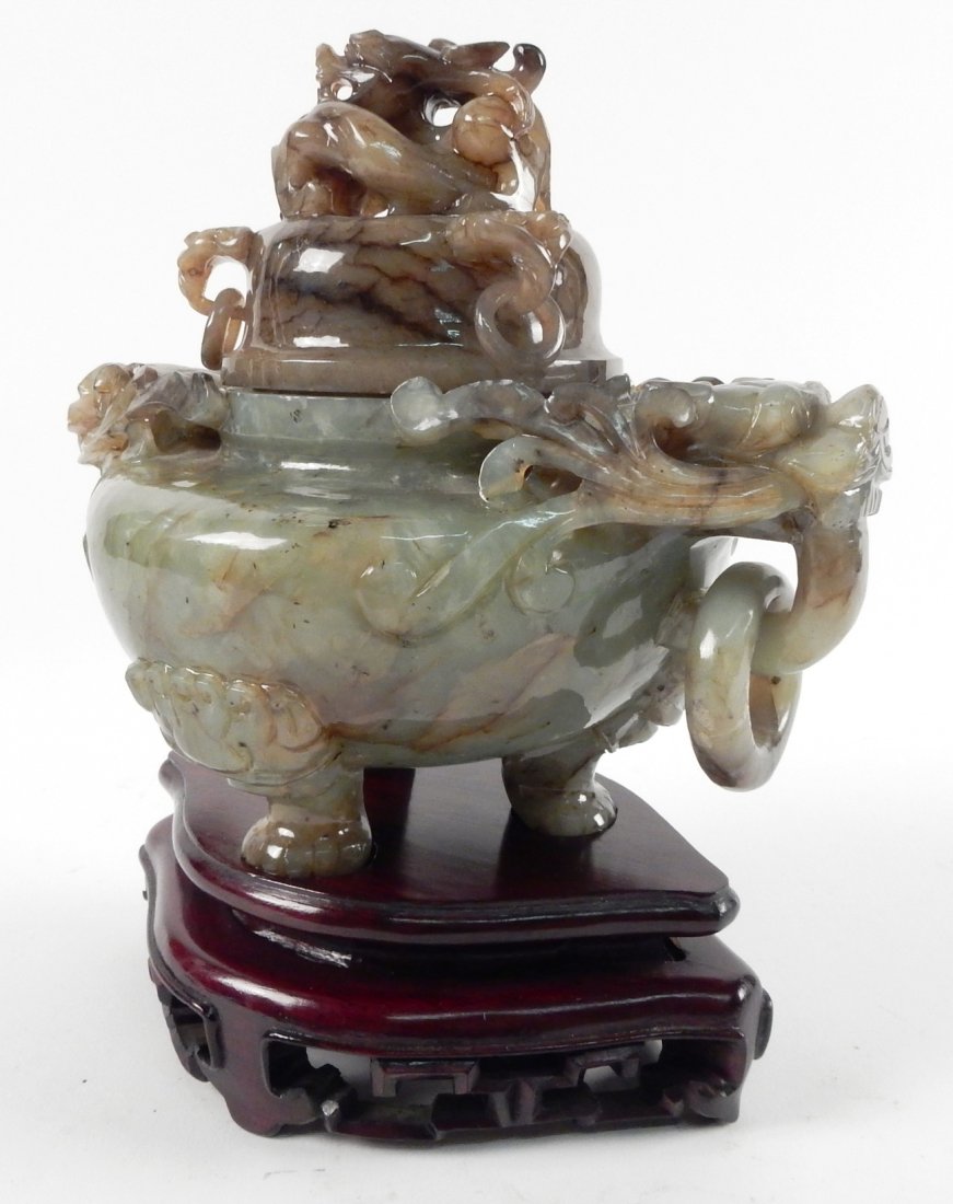 Chinese carved jade incense burner with foo dog lid and rings on wooden baseLake Lanier Antiques LLC4.4(25)$100Mar 02, 2026