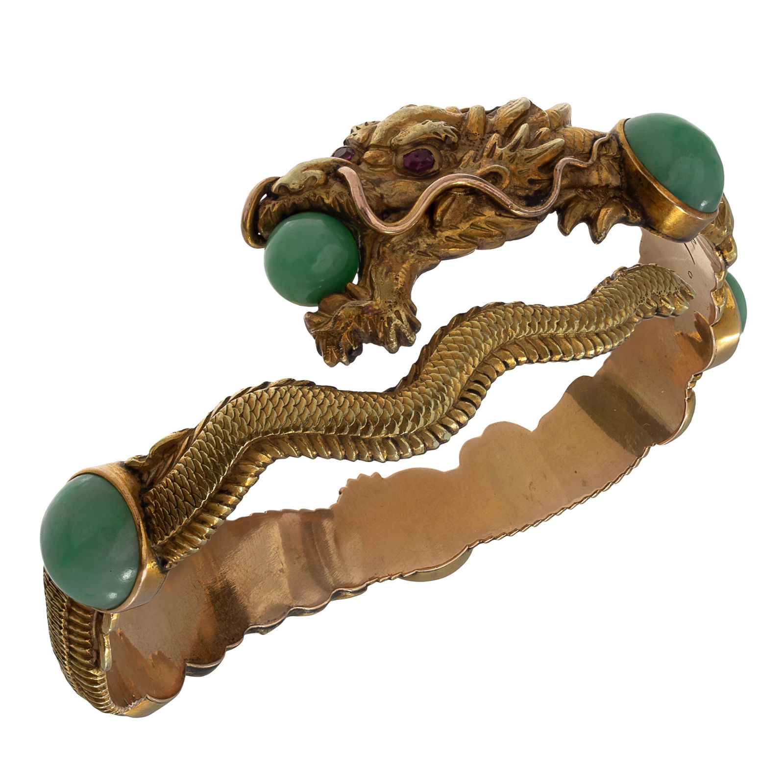 Jade, Ruby, 14k Yellow Gold Dragon Bracelet