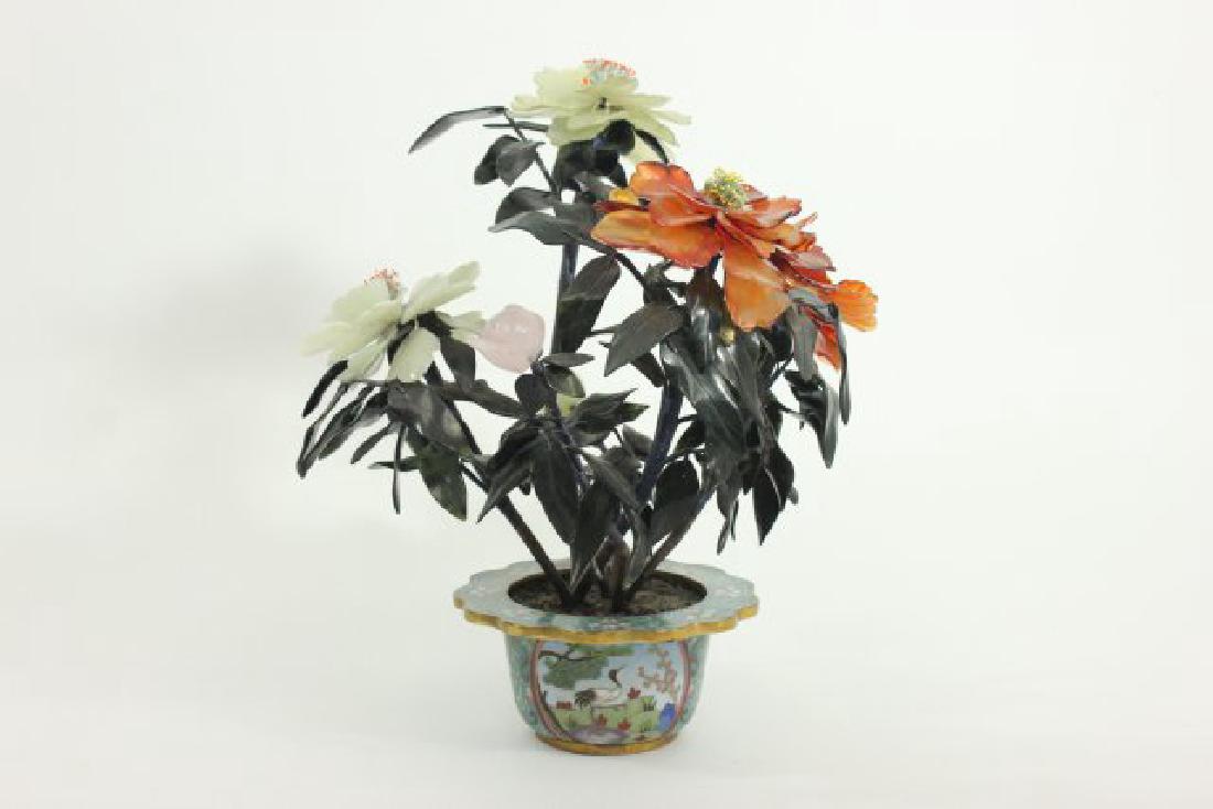 SoldCHINESE REPUBLIC PERIOD JADE TREE IN CLOISONNE POTChinese Republic period jade tree in a rectangular cloisonne pot. Various types of carved hardstone flowers with green hardstone leaves. Measures a total of approx. 21" tall x 21" long and 17" wide. CSee Sold Price