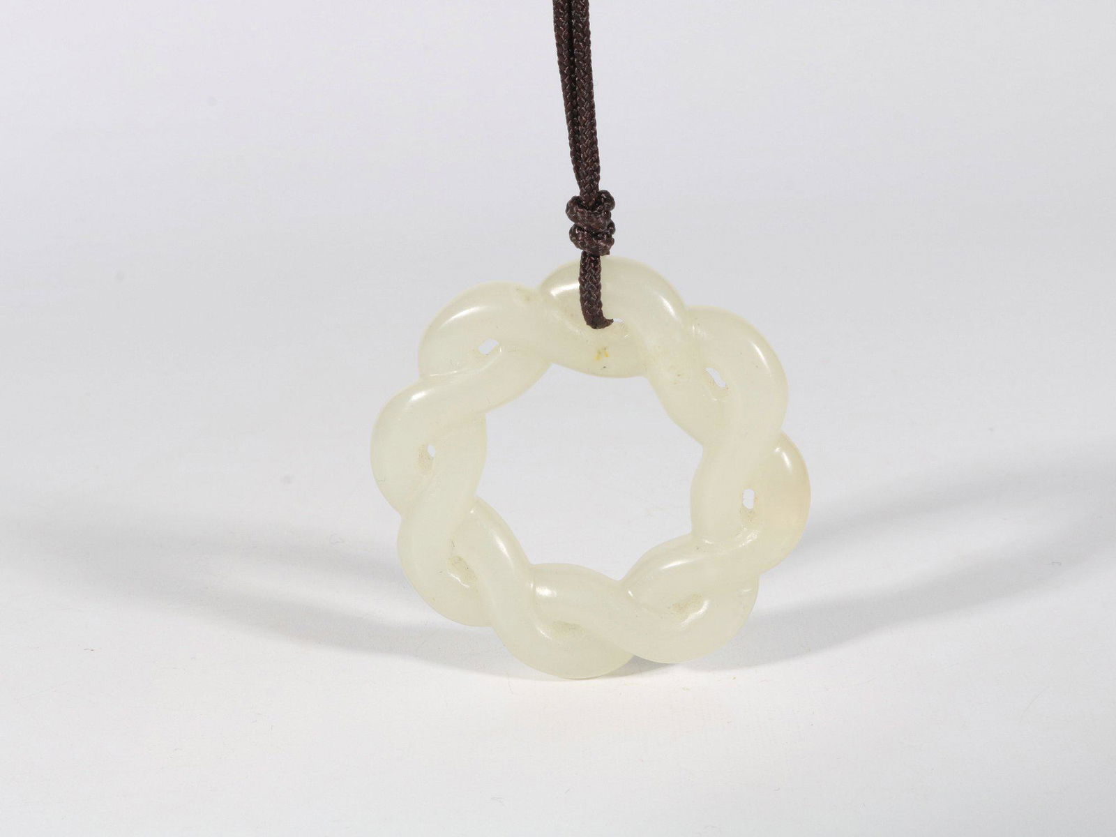 SoldChinese White Jade NecklaceA 19th century Chinese White Jade pendant necklace. Carved Lock form pendant with Bird and Lotus design suspended on a triple-ring Jade chain with Green silk thread. Minor surface wear. Pendant is 3 1See Sold Price