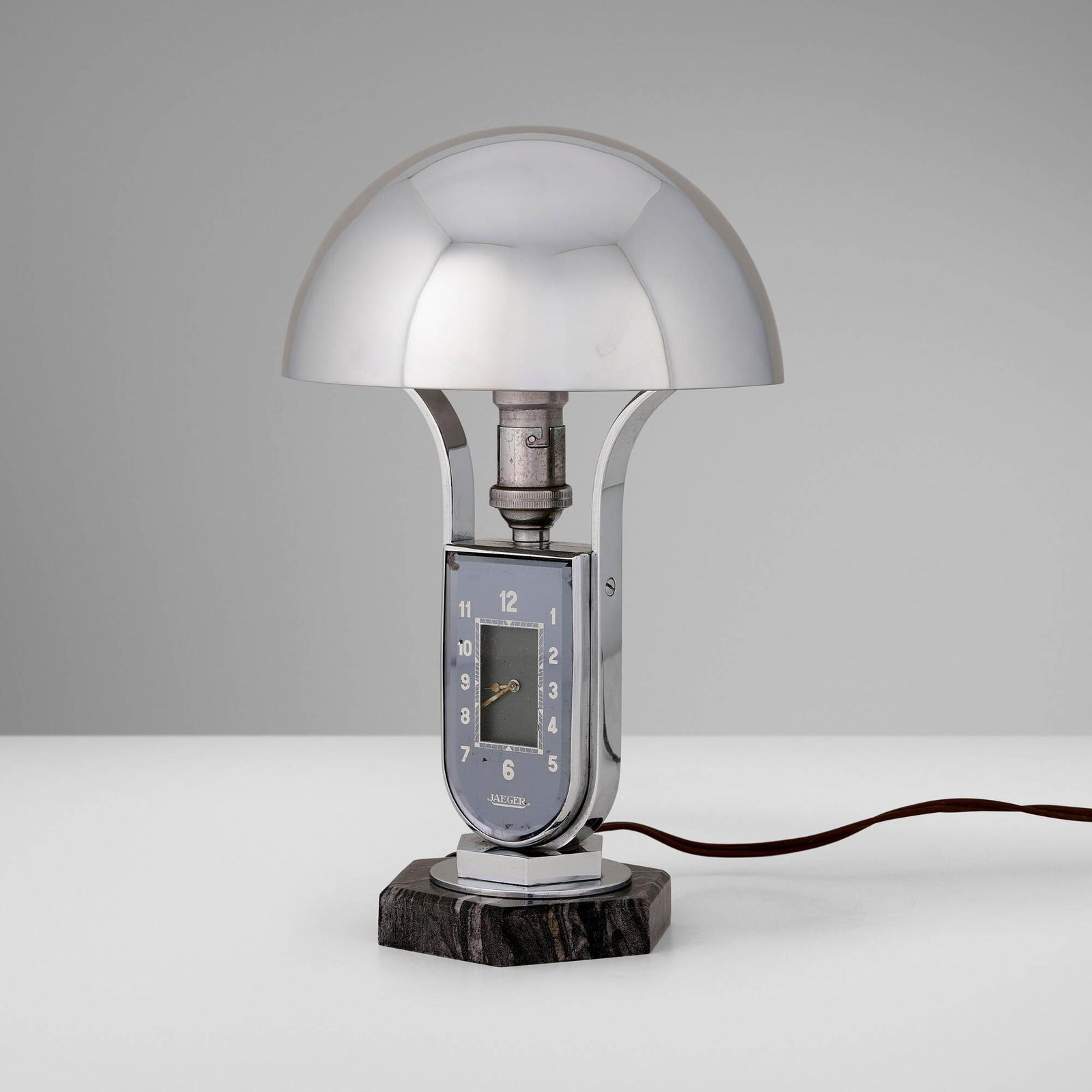 SoldArt Deco clocks, ash tray and lamp pairArt Deco clocks, ash tray and lamp pair to include a quartz table clock, 6 3/8"L x 3 3/4"H, chip to back corner, hairlines, a French 8-day Dep pheasant topped multi-agate mantle clock, chip to cornerSee Sold Price