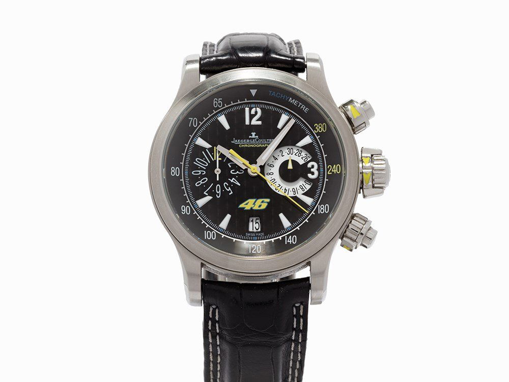 SoldJaeger LeCoultre Chronograph Master Compressor Watch 146.8.25METAL: Stainless Steel. MEASUREMENTS: Case 42mm, band will fit approx. 8" wrist. One chip on crystal between 6 and 7 o'clock, few hairlines scratches. MOVEMENT: Automatic, working order. Ref.See Sold Price