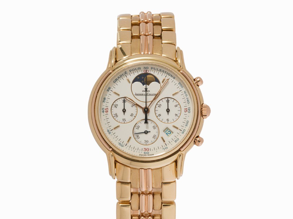 SoldJaeger Le Coultre men's quartzJaeger Le Coultre men's quartz watch, mod. Odysseus No. 2391, GG750/000, chronograph, moon phase, date between 4 and 5 o'clock, screwed case back, white dial with gilded line indices, gilded hands, saSee Sold Price