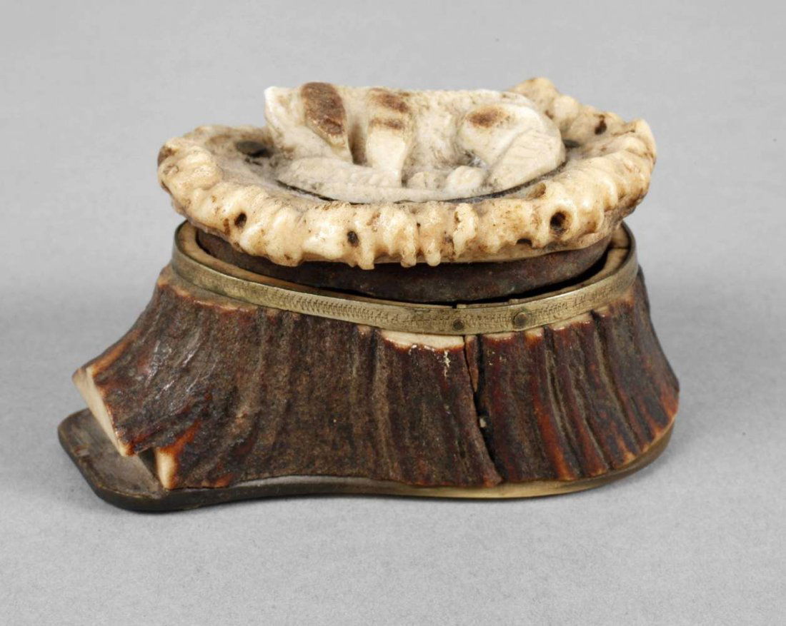 SoldJagdliche Schreibgarnitur4-tlg.; Stiftablage mit Aufsatz eines qualitätvoll modellierten röhrenden Hirsches in Bronze. Dazu Tinten- und Sandgefäß aus Glas mit Messingdeckel sowie eine versilberte Löschwiege mit floralerSee Sold Price