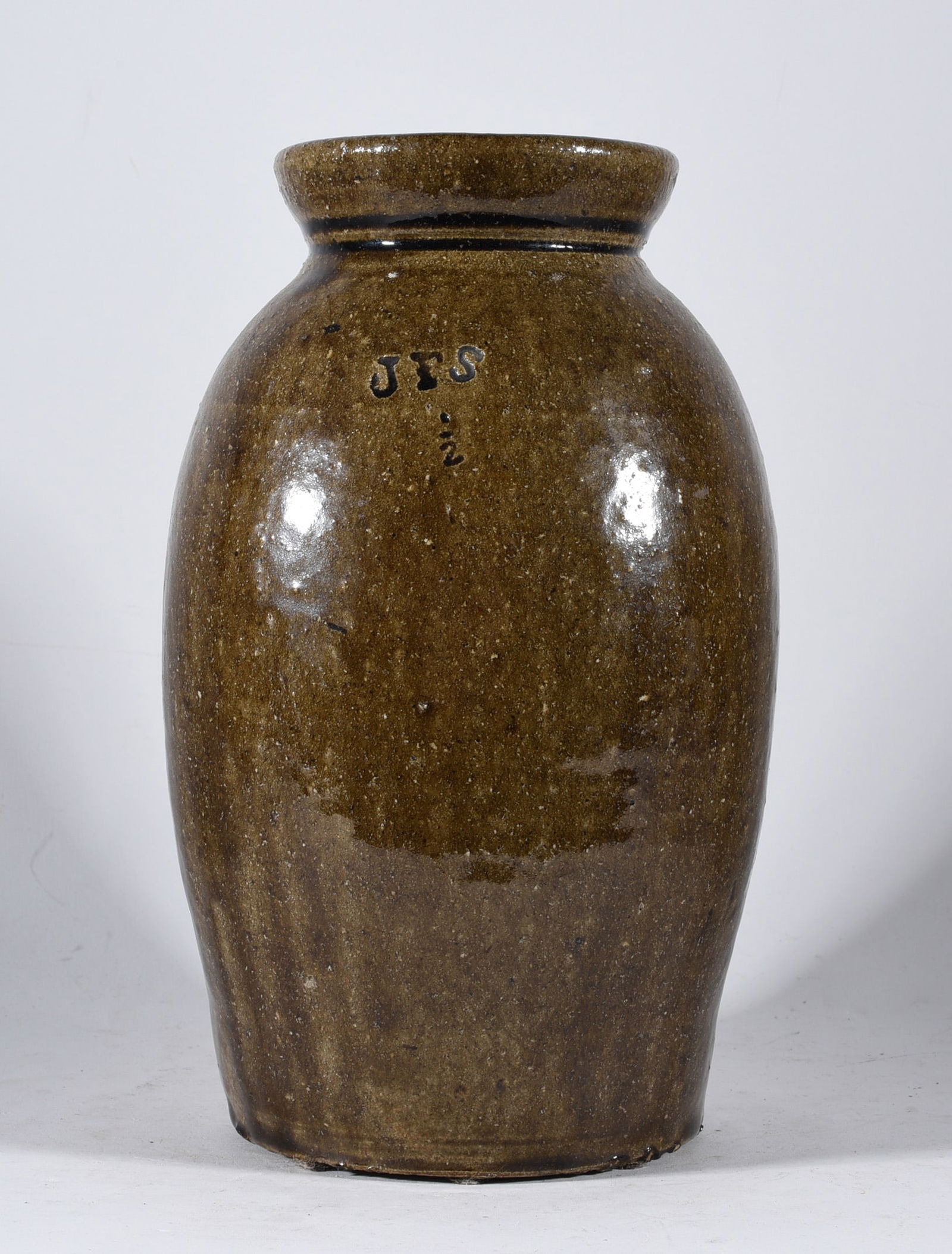 Sold3 Gal. James Franklin Seagle, Vale, Lincoln County, NCThree-Gallon Alkaline-Glazed Stoneware Jug, Stamped "JFS", James Franklin Seagle, Vale, NC, third quarter 19th century, ovoid jug with tooled spout, the front featuring the impressed initials, "JFS",See Sold Price