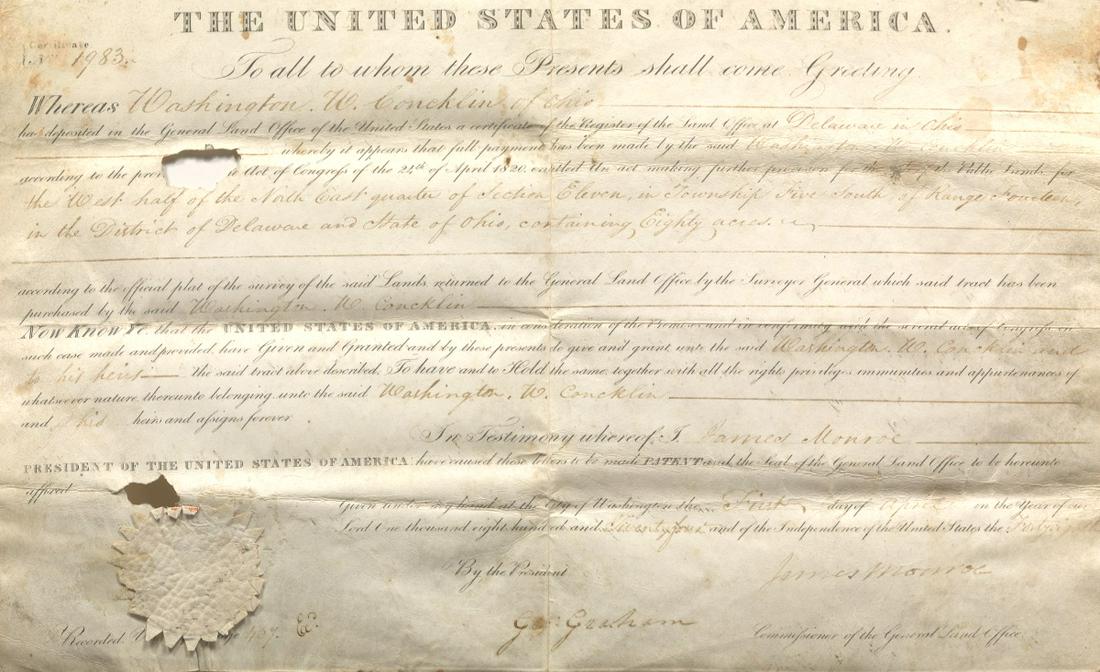 James Monroe Signed Land Grant, 1824